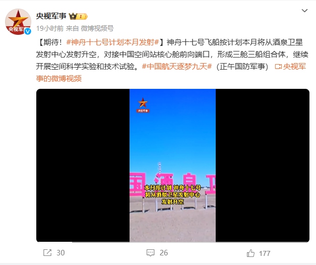 據(jù)“央視軍事”微博賬號報道 神舟十七號飛船按計劃本月(十月)將從酒泉衛(wèi)星發(fā)射中心發(fā)射升空,對接中國空間站核心艙前向端口,形成三艙三船組合體,繼續(xù)開展空間科學實驗和技術試驗。