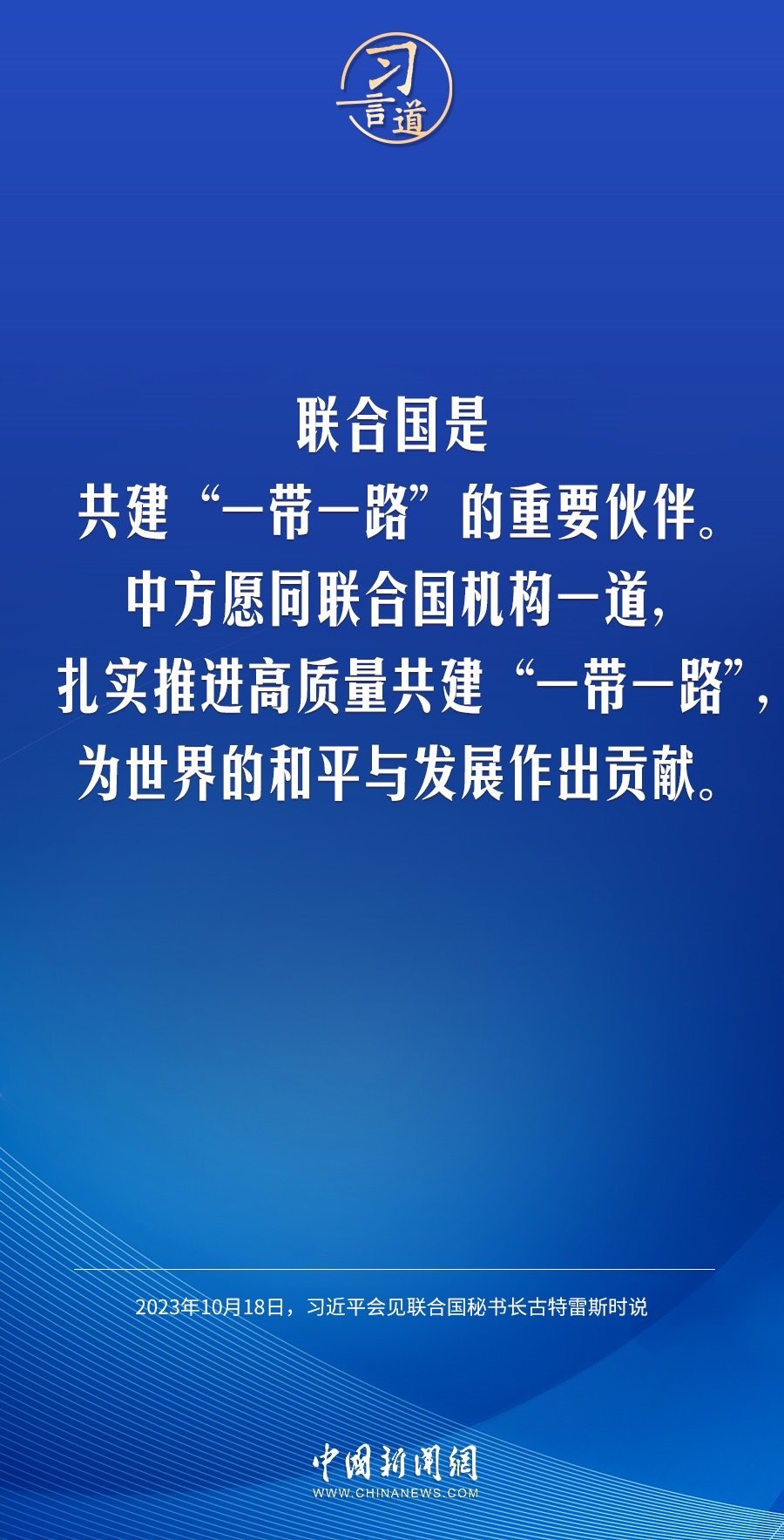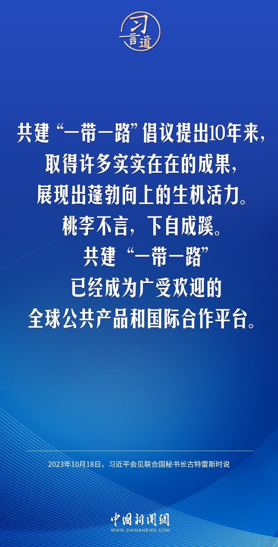 10月18日晚,中國國家主席習近平在人民大會堂會見來華出席第三屆“一帶一路”國際合作高峰論壇的聯(lián)合國秘書長古特雷斯。習近平指出——