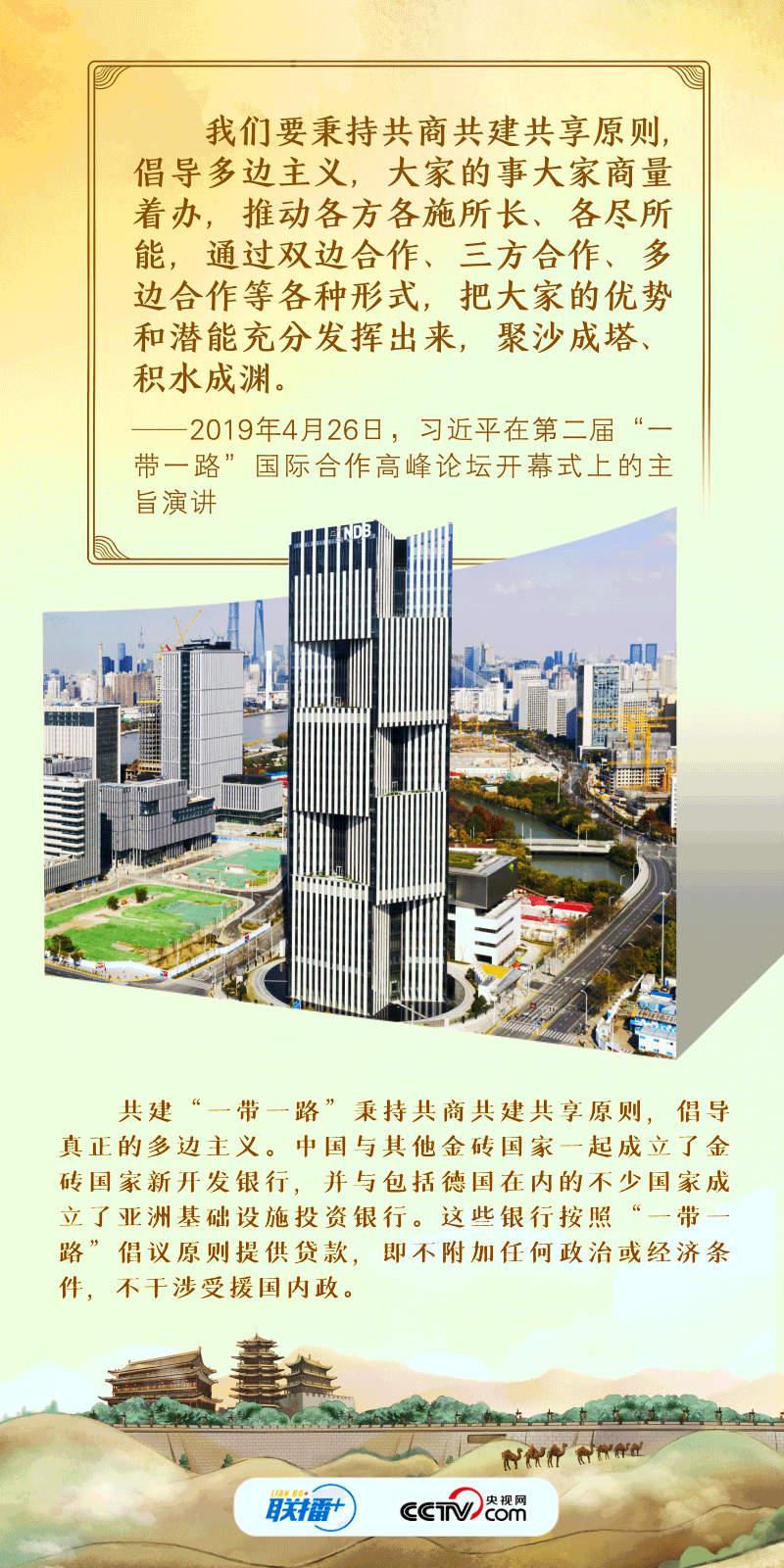 “古絲綢之路綿亙?nèi)f里、延續(xù)千年,積淀了以和平合作、開放包容、互學(xué)互鑒、互利共贏為核心的絲路精神?!?017年,習(xí)近平主席在首屆“一帶一路”國際合作高峰論壇開幕式上系統(tǒng)闡述了絲路精神的內(nèi)涵,倡議將“一帶一路”建成和平之路。