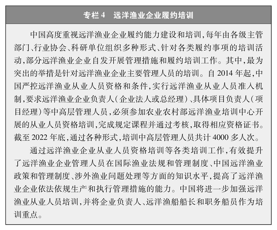 中國(guó)遠(yuǎn)洋漁業(yè)管理堅(jiān)持以科學(xué)為基礎(chǔ),建立并完善由主管部門、行業(yè)協(xié)會(huì)、科研單位通力合作的管理和履約科技支撐體系,共同制定漁業(yè)管理策略、實(shí)施管理措施并對(duì)實(shí)施效果進(jìn)行評(píng)價(jià)。充分發(fā)揮行業(yè)協(xié)會(huì)在組織協(xié)調(diào)漁業(yè)生產(chǎn)、規(guī)范企業(yè)行為、組織從業(yè)人員培訓(xùn)、加強(qiáng)行業(yè)自律、推廣示范應(yīng)用等方面的作用,成立遠(yuǎn)洋漁業(yè)履約研究中心、遠(yuǎn)洋漁業(yè)數(shù)據(jù)中心,完善履約工作機(jī)制,加強(qiáng)相關(guān)科研機(jī)構(gòu)和智庫建設(shè),逐步提高履約能力和成效。