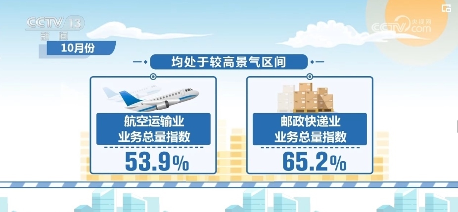 10月份,航空運輸業(yè)業(yè)務(wù)總量指數(shù)為53.9%,郵政快遞業(yè)業(yè)務(wù)總量指數(shù)為65.2%,均處于較高景氣區(qū)間。