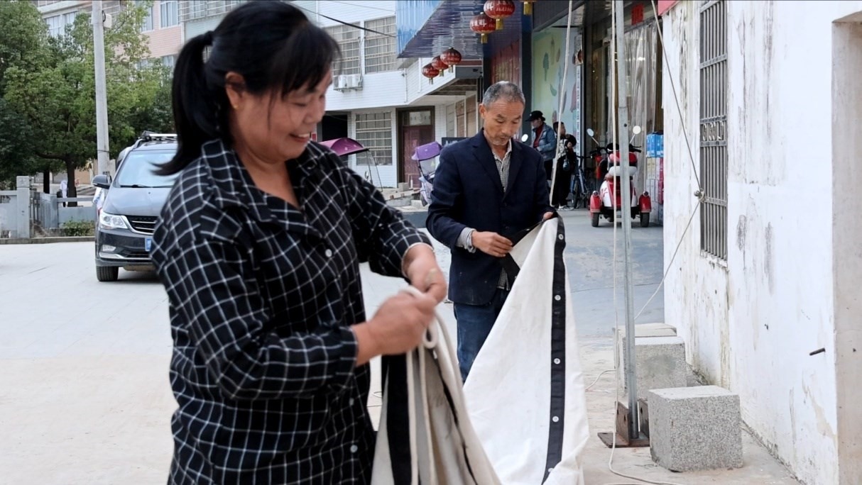 下午4點,夫妻倆開始忙活,盤整放映設(shè)備,把音響、銀幕、放映機,一件件裝車。下午五點半,到達(dá)放映的地方,兩人麻利地安裝起銀幕架子??措娪暗膱雒鏇]有了多年前的壯觀,搬著小板凳、小馬扎來看電影的,大都是老人和小孩。