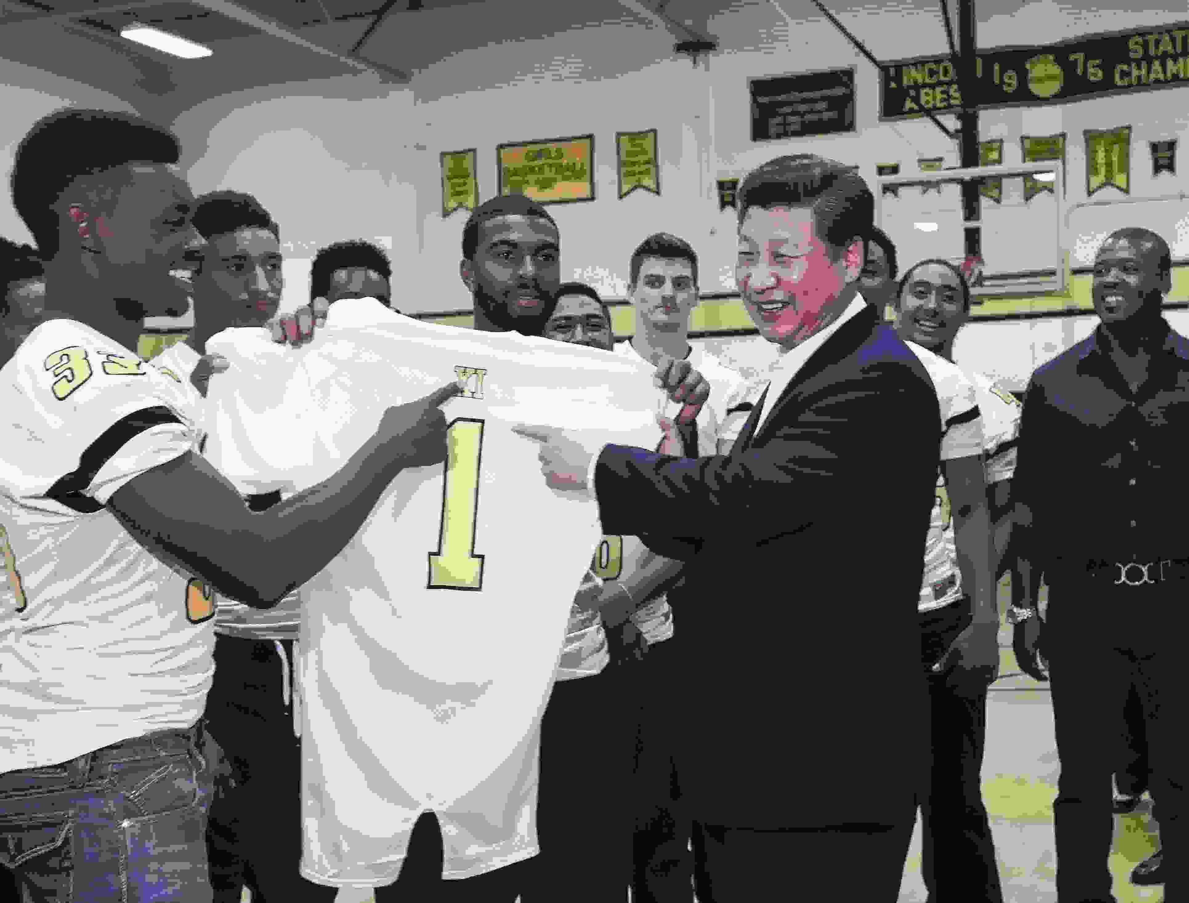△ 2015年9月23日,國(guó)家主席習(xí)近平參觀美國(guó)塔科馬市林肯中學(xué)。這是習(xí)近平接受學(xué)生們贈(zèng)送的橄欖球衣。