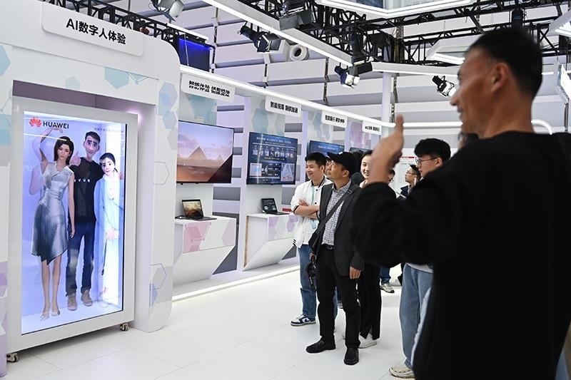 △2023年11月7日,2023年世界互聯(lián)網(wǎng)大會(huì)“互聯(lián)網(wǎng)之光”博覽會(huì)在浙江烏鎮(zhèn)開幕。圖為觀眾在展臺(tái)體驗(yàn)與AI數(shù)字人合影。