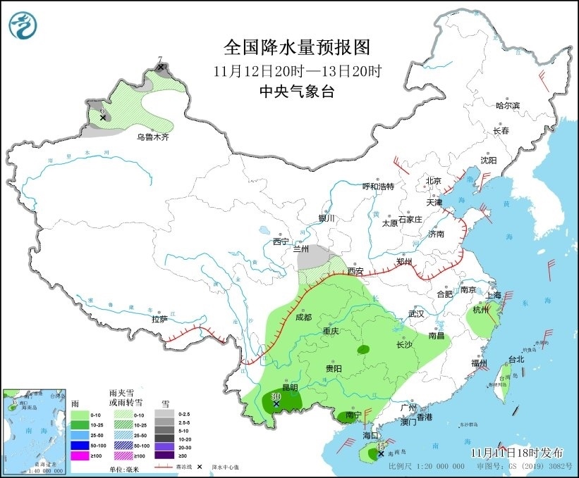 11月11日20時(shí)至12日20時(shí),新疆沿天山地區(qū)、西藏中部和東部、青海北部和東南部、甘肅中南部和河西、山東半島、川西高原北部等地部分地區(qū)有小雪或雨夾雪。四川盆地、貴州南部、湖南西南部、海南島等地部分地區(qū)有中到大雨,局地有暴雨(50~65毫米)。遼東半島、青海北部、河北北部、山東半島、四川盆地中部、浙江東部等地部分地區(qū)有5~6級(jí)風(fēng)。東海南部、臺(tái)灣海峽、臺(tái)灣以東洋面、巴士海峽、南海北部和中部、北部灣有7~8級(jí)、陣風(fēng)9級(jí)的大風(fēng)(見圖4)。