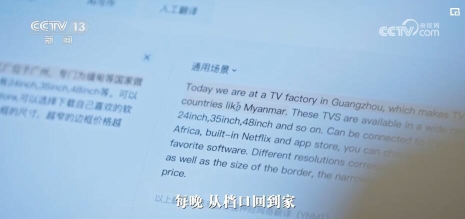 方菁:這是我們找的專(zhuān)門(mén)做外貿(mào)電視機(jī)的一家(工廠(chǎng))。我給大家介紹一下,“大家好,我是方菁,今天我們來(lái)到了電視機(jī)工廠(chǎng)”。要介紹得更精密的時(shí)候,我就不知道該怎么說(shuō)了。打開(kāi)我的翻譯軟件,先把我要呈現(xiàn)的字幕輸入進(jìn)去。