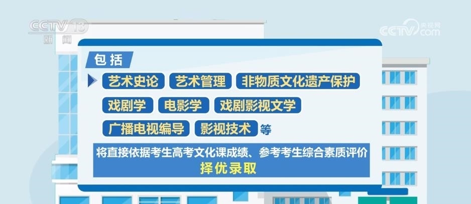 據(jù)了解,藝術(shù)類專業(yè)依據(jù)考生高考文化成績、專業(yè)考試成績,參考綜合素質(zhì)評價(jià)進(jìn)行招生錄取。此次藝考改革一個(gè)重要的變化是,部分藝術(shù)類專業(yè)不再組織專業(yè)考試,包括藝術(shù)史論、藝術(shù)管理、非物質(zhì)文化遺產(chǎn)保護(hù)、戲劇學(xué)、電影學(xué)、戲劇影視文學(xué)、廣播電視編導(dǎo)、影視技術(shù)等,將直接依據(jù)考生高考文化課成績、參考考生綜合素質(zhì)評價(jià),擇優(yōu)錄取。