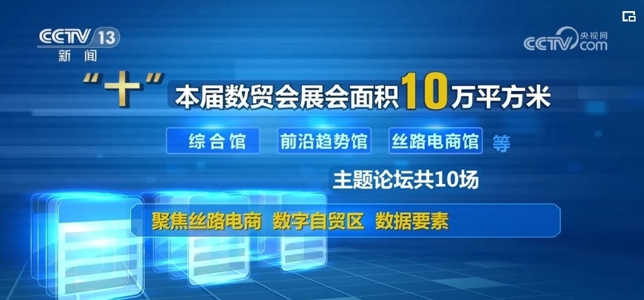 “十”:本屆數(shù)貿(mào)會展會面積10萬平方米,分為綜合館、前沿趨勢館、絲路電商館等。主題論壇共10場,聚焦絲路電商、數(shù)字自貿(mào)區(qū)、數(shù)據(jù)要素治理等主題。