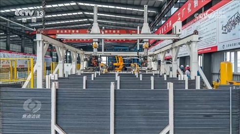 中交二航局常泰長江大橋項目部常務副經(jīng)理王輝:“傳統(tǒng)的橋塔鋼筋怎么做呢?通過吊機把鋼筋吊到塔上,作業(yè)工人一根根把鋼筋綁起來,個人能力有差別,質(zhì)量和精度,鋼筋間距也很難控制,現(xiàn)在我們采用什么理念呢?就是部品的理念,把塔的鋼筋在下面做成一塊一塊的,就像搭積木一樣,大型吊機把它吊上去,然后一節(jié)節(jié)堆起來。”