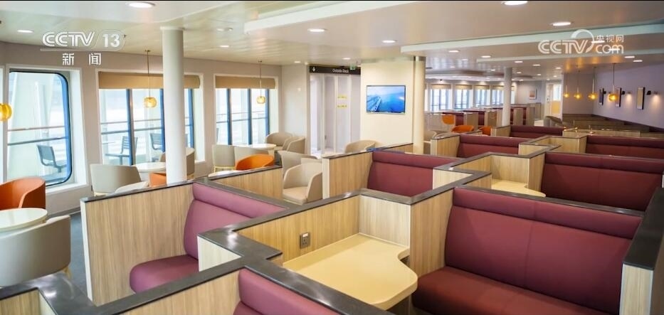 中國船舶廣船國際客滾船大項目經(jīng)理 李會倫:這艘船采用雙頭設計,進出港不用調(diào)頭,船員可分別在兩個駕駛室駕駛這艘船,因此可以節(jié)省大量進出港時間。船上共配備了1160塊大容量電池,電池裝船容量達到8.8兆瓦時,相當于150輛電動汽車的電池容量之和,可在近海航行時采用全電力推進,實現(xiàn)零排放。