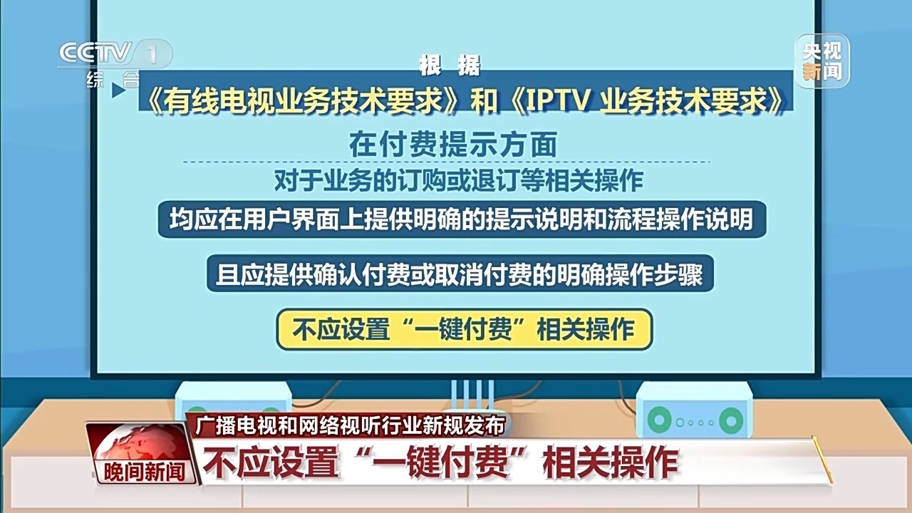 在付費提示方面,對于業(yè)務的訂購或退訂等相關操作,均應在用戶界面上,提供明確的提示說明和流程操作說明,且應提供確認付費或取消付費的明確操作步驟,不應設置“一鍵付費”相關操作。此外,有線電視和IPTV遙控器應具備快捷看直播頻道的按鍵,通過此按鍵直接進入全屏直播,按鍵名稱應為“看電視”。