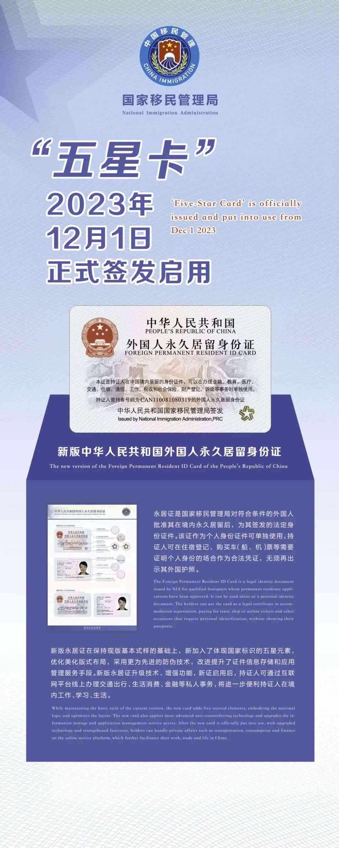 央視網(wǎng)消息:據(jù)國(guó)家移民管理局,新版中華人民共和國(guó)外國(guó)人永久居留身份證12月1日正式簽發(fā)啟用。因加入了體現(xiàn)國(guó)家標(biāo)識(shí)的五星元素,新版永居證被稱為“五星卡”。首日共有50名取得在華永久居留資格的外國(guó)人領(lǐng)取到了首批“五星卡”。他們來自美國(guó)、德國(guó)、英國(guó)、法國(guó)、俄羅斯、瑞典、新加坡、韓國(guó)等二十余個(gè)國(guó)家,均為在經(jīng)濟(jì)、教育、科技、文化、衛(wèi)生等多個(gè)領(lǐng)域?yàn)橹袊?guó)經(jīng)濟(jì)社會(huì)發(fā)展做出了突出貢獻(xiàn)人員,當(dāng)中包括中國(guó)政府友誼獎(jiǎng)獲得者,在華長(zhǎng)期任職工作的外籍高層次管理和專業(yè)技術(shù)人員,在重點(diǎn)院校、科研機(jī)構(gòu)長(zhǎng)期從事教學(xué)科研的外籍教授學(xué)者等。當(dāng)天,在北京、天津、上海、廣東等地公安機(jī)關(guān)出入境辦證窗口,還有不少永久居留外國(guó)人前來咨詢申請(qǐng)換發(fā)“五星卡”。