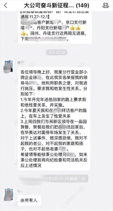 ·江蘇銀行鎮(zhèn)江分行回應(yīng)女員工舉報被領(lǐng)導(dǎo)施壓發(fā)生性關(guān)系:已免去馬某團(tuán)隊(duì)經(jīng)理職務(wù)。