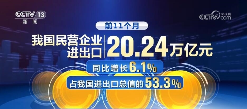前11個月,我國民營企業(yè)進出口20.24萬億元,同比增長6.1%,占我國進出口總值的53.3%,提升3.1個百分點。同期,上海、江蘇、浙江、安徽等長三角區(qū)域合計進出口13.87萬億元,同比增長0.6%,其中出口同比增長1%,拉動同期我國出口增長0.4個百分點,強勁活躍的增長極功能不斷鞏固提升。???????