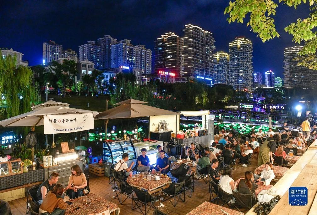 2023年9月14日,游客和市民在貴州省黔西南布依族苗族自治州興義市馬嶺河夜間消費(fèi)聚集區(qū)休閑。新華社記者 楊文斌 攝