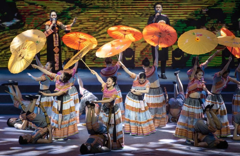 2023年1月18日,以“同心筑厚誼 攜手共發(fā)展”為主題的2023年中越跨國春節(jié)聯(lián)歡晚會在中國云南省紅河哈尼族彝族自治州河口瑤族自治縣舉行,越南老街省民族藝術歌舞團的演員在晚會上表演歌舞《漂浮在云端的節(jié)日》。