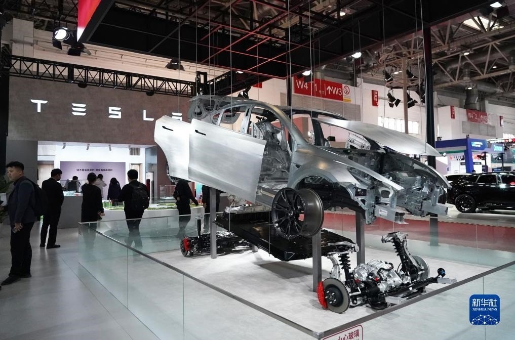 這是首屆中國(guó)國(guó)際供應(yīng)鏈促進(jìn)博覽會(huì)智能汽車鏈展區(qū)的特斯拉展位(2023年11月30日攝)。新華社記者 任超 攝
