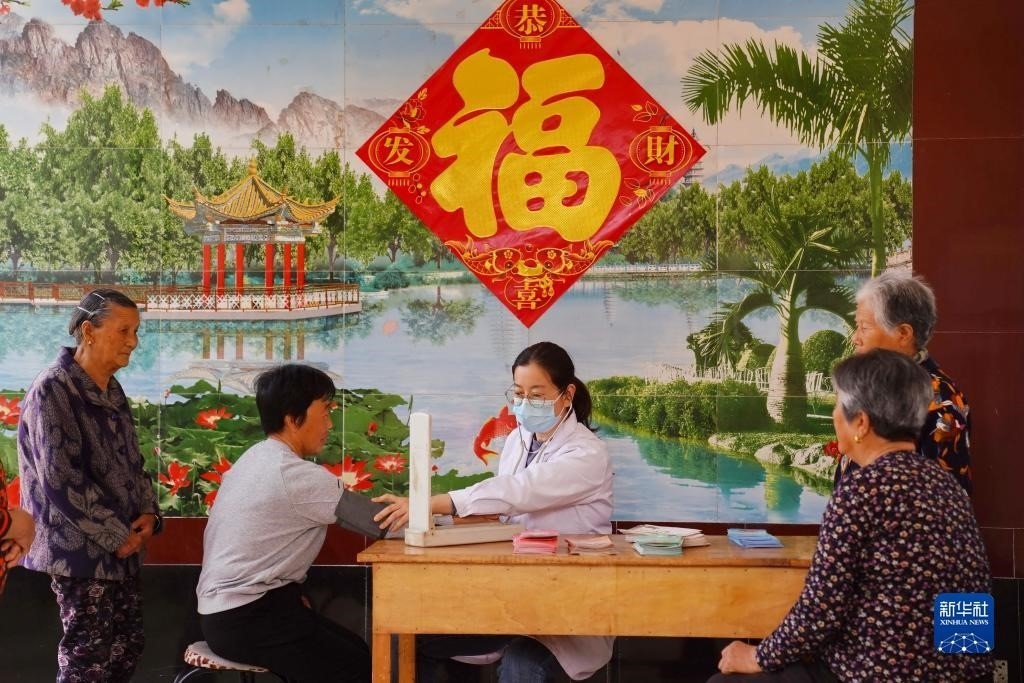 河北省平鄉(xiāng)縣尋召村村醫(yī)在“幸福小院”內(nèi)為老人們量血壓(2023年4月20日攝)。近年來,河北省平鄉(xiāng)縣利用農(nóng)村閑置院落,按照“就近集中、鄰里互助、抱團(tuán)養(yǎng)老”的模式,采取社會(huì)捐助、鄉(xiāng)村籌集、縣財(cái)政補(bǔ)助等形式,先后打造出300余個(gè)“幸福小院”。新華社記者 牟宇 攝