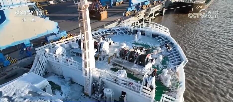 總臺(tái)央視記者 張叢婧:大家可以看到,現(xiàn)在船上掛滿了一層冰棱,非常堅(jiān)硬,現(xiàn)在甲板上特別滑,走路的時(shí)候要非常注意。