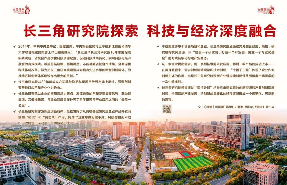 2003年底,在時任浙江省委書記習近平的親自推動下,浙江清華長三角研究院(以下簡稱“長三角研究院”)正式成立,落地浙江嘉興。作為浙江省人民政府與清華大學共建的新型創(chuàng)新載體,長三角研究院成立以來立足浙江、面向長三角,以自收自支、市場化運營探索走出一條省校合作的有效模式,逐步成長為長三角區(qū)域重要的產(chǎn)學研試驗平臺和成果轉(zhuǎn)化基地。
