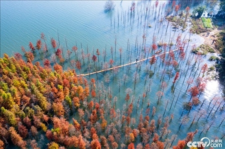 福建南平,延平區(qū)爐下鎮(zhèn)斜溪社區(qū)村洲頭島的落羽杉樹掩映閩江,色彩繽紛點(diǎn)綴冬日。