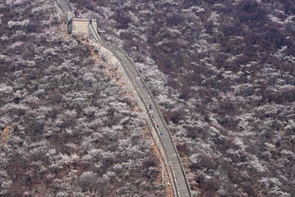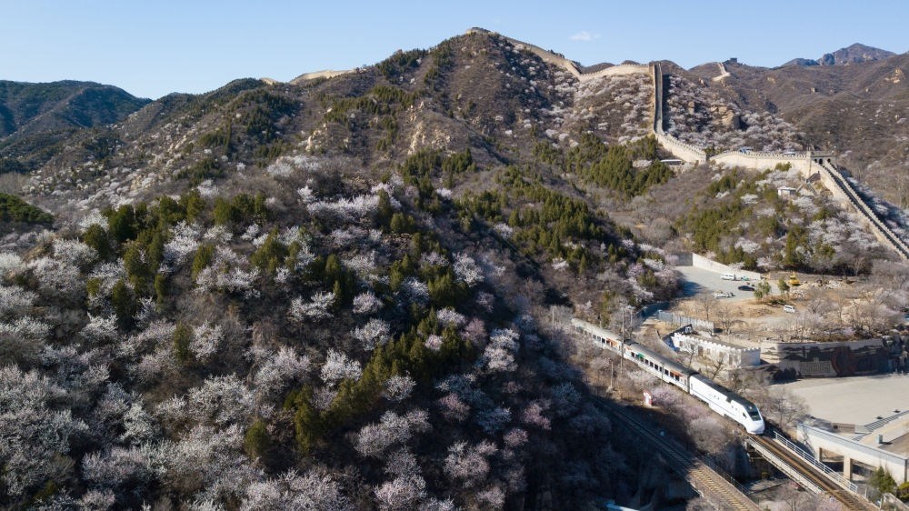 一列火車在北京水關(guān)長城附近的山花中穿行(無人機(jī)照片,2020年3月27日攝)。