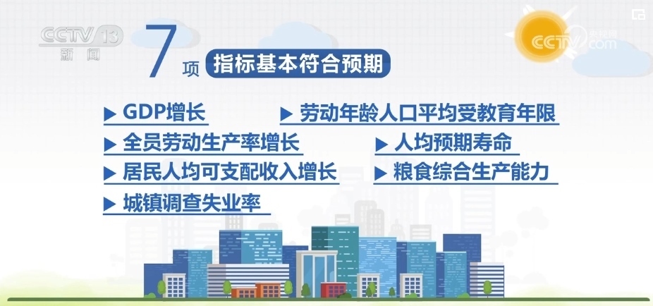 7項(xiàng)指標(biāo)基本符合預(yù)期,分別是GDP增長(zhǎng)、全員勞動(dòng)生產(chǎn)率增長(zhǎng)、居民人均可支配收入增長(zhǎng)、城鎮(zhèn)調(diào)查失業(yè)率、勞動(dòng)年齡人口平均受教育年限、人均預(yù)期壽命、糧食綜合生產(chǎn)能力。