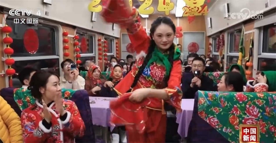 總臺央視記者 楊曜語:我即將登上的列車就是從哈爾濱開往漠河的國內(nèi)首個沉浸式東北民俗文化體驗列車,坐過的人都說一上車就想盤腿兒了,我們趕緊來體驗一下!一上車我就被濃濃的東北文化所感染到了,整個車廂都被東北大花的經(jīng)典配色裝飾著,再加上隨手就能品嘗到東北特色美食,坐在床鋪上就感覺一秒鐘“穿越”到農(nóng)家炕頭。