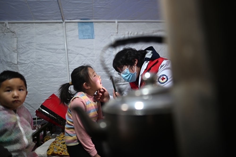 在青海省海東市民和回族土族自治縣官亭鎮(zhèn)喇家村安置點(diǎn),山東援青醫(yī)生李鴻皓(右)為喇生婷檢查身體(12月23日攝)。積石山6.2級(jí)地震發(fā)生以來,在青海省海東市民和回族土族自治縣,當(dāng)?shù)蒯t(yī)療機(jī)構(gòu)和援青醫(yī)療隊(duì)通過設(shè)立醫(yī)療點(diǎn)、開展巡診等方式保障安置點(diǎn)群眾就醫(yī)服務(wù),守護(hù)群眾健康。新華社記者 張宏祥 攝