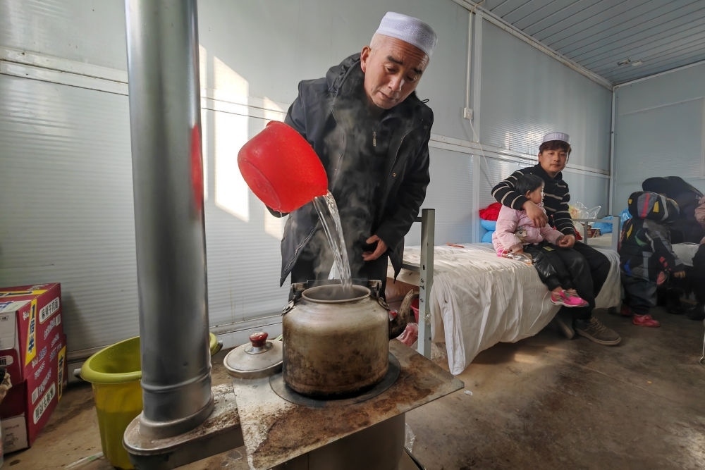 在甘肅臨夏積石山縣大河家鎮(zhèn)梅坡村活動(dòng)板房安置點(diǎn),受災(zāi)村民在活動(dòng)板房內(nèi)的火爐上燒水(12月21日攝)。新華社記者 范培珅 攝