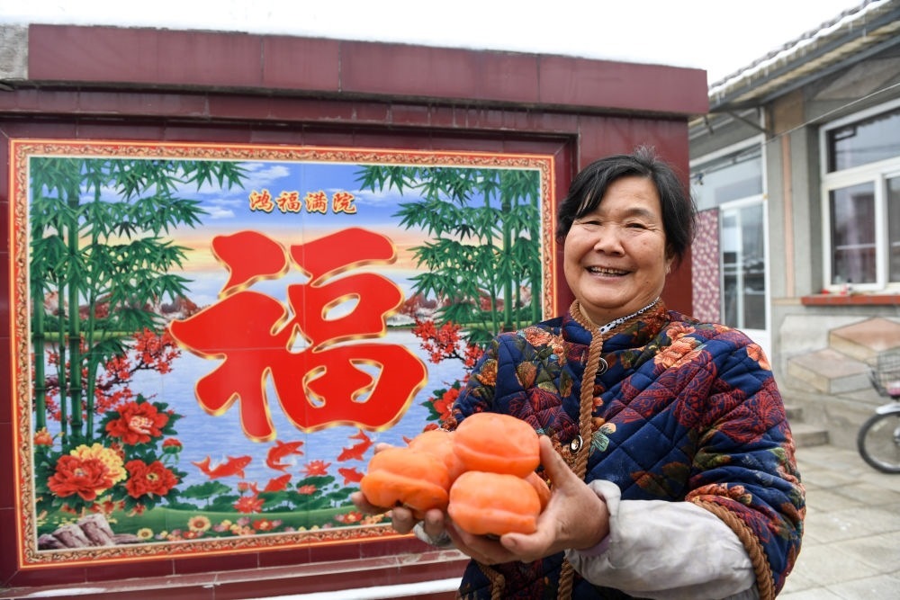 在北京市房山區(qū)佛子莊鄉(xiāng)陳家臺(tái)村,61歲的村民馬書金在修繕完畢的院子里展示不久前在山上摘得的柿子(12月12日攝)。新華社記者 鞠煥宗 攝