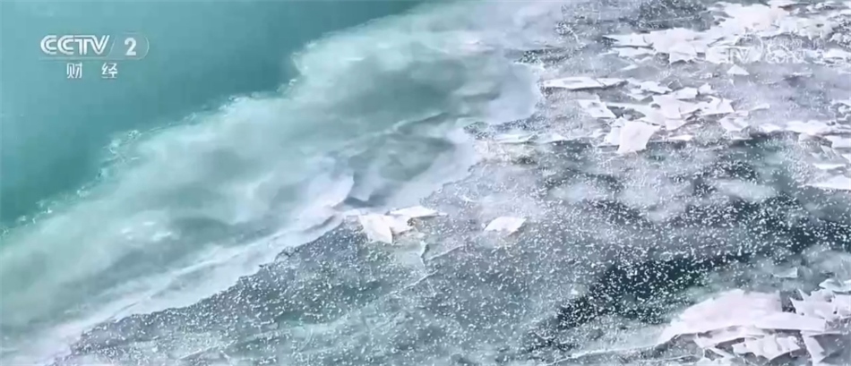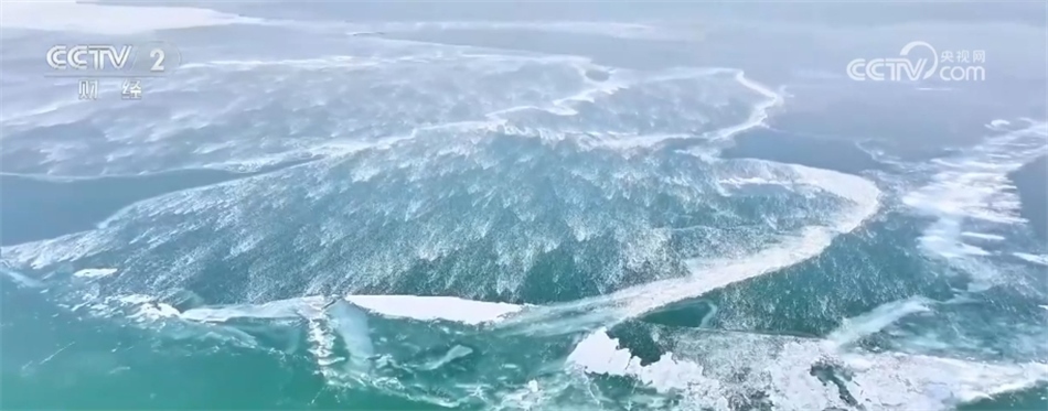 從空中俯瞰,金色的沙灘、潔白的冰線、剔透的碎冰以及蔚藍的湖面,共同構(gòu)成一幅色彩明艷的線條畫。