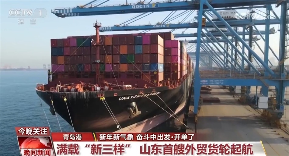 新年伊始,山東首艘外貿(mào)貨輪從青島港起航。3500多個(gè)標(biāo)箱里滿載包括電動(dòng)載人汽車、鋰離子蓄電池、太陽(yáng)能電池等外貿(mào)“新三樣”,總貨值約2億人民幣。