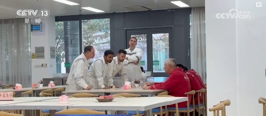 一輛輛各式各樣的自行車平穩(wěn)穿梭在安全區(qū),車上的工友有事兒就會(huì)互相召喚,拿出圖紙解決問(wèn)題,互通有無(wú)。而在職工和船東餐廳里,一張張餐桌上分區(qū)標(biāo)記了各個(gè)業(yè)主單位。吃完飯撤掉餐具,大家就開始“頭腦風(fēng)暴”,現(xiàn)場(chǎng)辦公。