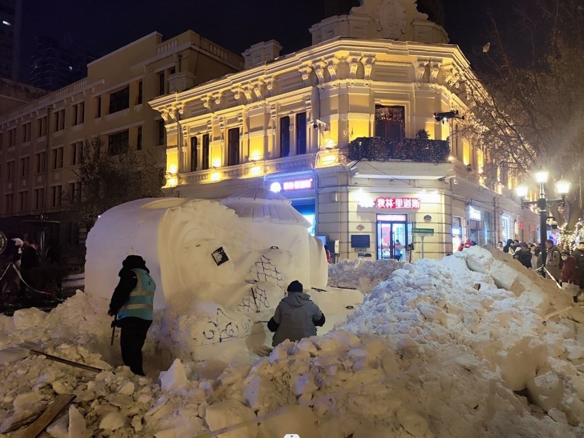 元旦假期的中央大街,鄂倫春族人牽馴鹿巡游,馬迭爾冰棍攤位前排起了隊(duì),天南海北的游客在這里感受寒冷徹骨與熱氣騰騰的交織。55歲的臧洪洲,正與其他幾位雕刻師傅一起打磨一座名叫“五谷豐登 年年有魚”的雪雕作品,夜幕降臨,留給他們的時(shí)間不多了。