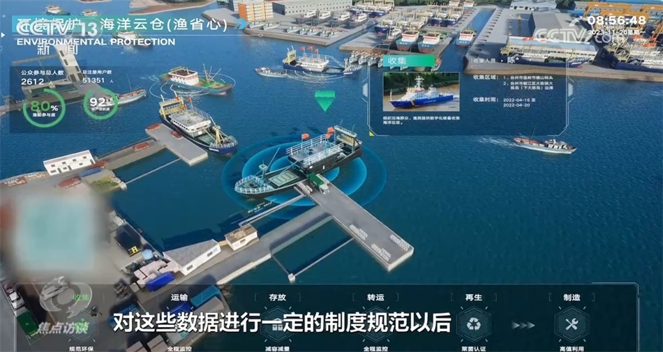 如何能夠證明這些塑料垃圾是來自海洋、岸灘而不是陸地呢?浙江是數(shù)字技術(shù)大省,大數(shù)據(jù)在這里發(fā)揮了重要作用。在藍景科技的后臺上,我們看到了整個臺州海域的所有漁船,包括漁船實時的定位、船速等等信息,通過這些數(shù)據(jù),藍景能夠推斷并掌握漁船真實的垃圾產(chǎn)生情況。這些數(shù)據(jù),大部分來源于政府。浙江省在2020年啟動政府?dāng)?shù)據(jù)開放,鼓勵符合條件的企業(yè)參與政府?dāng)?shù)據(jù)的開發(fā)利用,激發(fā)數(shù)據(jù)要素價值。臺州市積極實踐,經(jīng)過對接、評估,向藍景開放一部分數(shù)據(jù)。