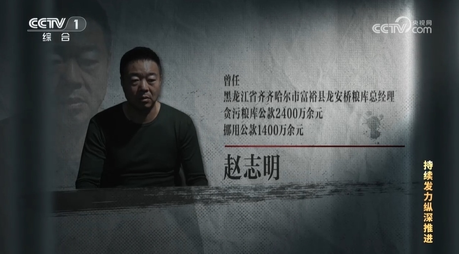 【解說詞】趙志明曾是黑龍江省齊齊哈爾市富??h龍安橋糧庫總經(jīng)理,經(jīng)查,他貪污糧庫公款2400萬余元,挪用公款1400萬余元,2023年3月被判處有期徒刑14年。龍安橋糧庫是在2015年由5家國有糧庫改革重組的,富??h政府持股51%、民營企業(yè)鼎倉公司持股49%。趙志明原本是鼎倉公司的老板,在這次改制中當(dāng)上了龍安橋糧庫總經(jīng)理。