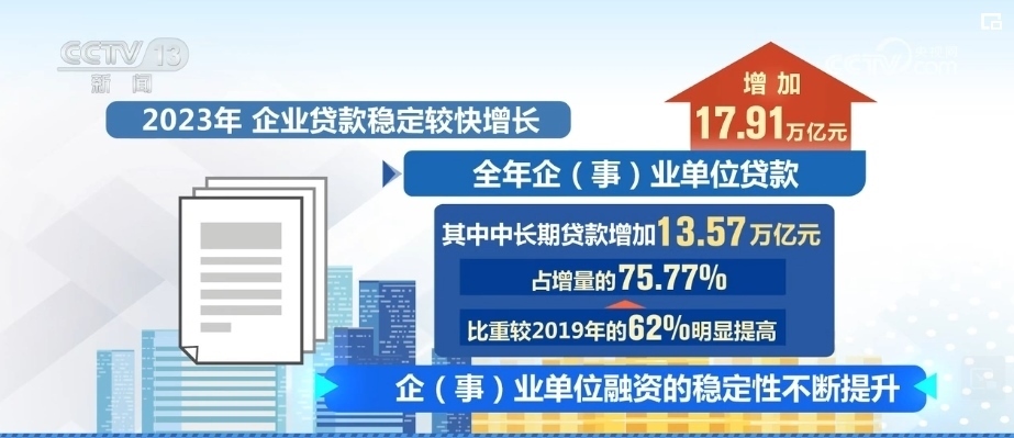 2023年,企業(yè)貸款穩(wěn)定較快增長。全年企(事)業(yè)單位貸款增加17.91萬億元,其中,中長期貸款增加13.57萬億元,占增量的75.77%,比重較2019年的62%明顯提高,企(事)業(yè)單位融資的穩(wěn)定性不斷提升。