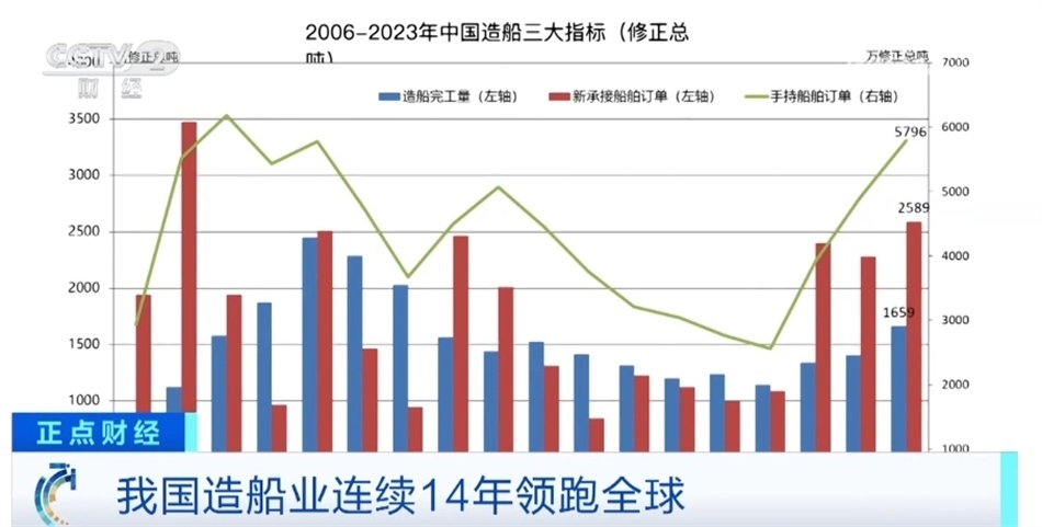 總臺央視記者 吳天白:在2023年中國造船業(yè)統(tǒng)計數(shù)據(jù)中,我們還可以看到三大指標占國際市場份額分別是50.2%、66.6%和55.0%,首次全部超過50%。從這幾張數(shù)據(jù)圖中,我們可以看出,我國高技術、高價值船型的新接訂單量創(chuàng)2008年以來新高,在這里我們可以看到中國新接綠色動力船舶訂單占國際市場的份額也是連年增長,2023年全年已經(jīng)達到了57%。這也表明了未來全球一半以上的新能源船都將產(chǎn)自中國。