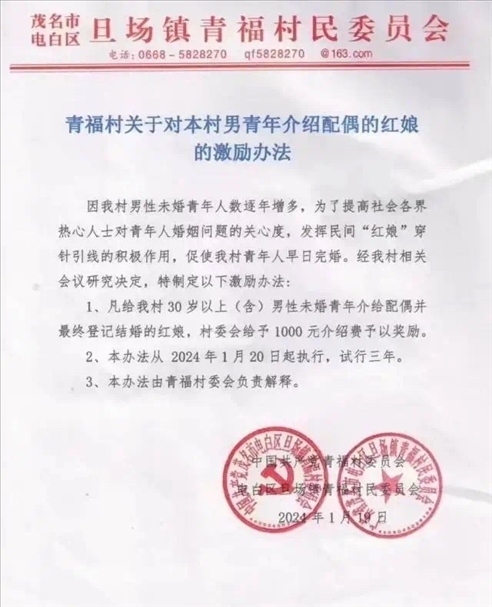 ·廣東茂名一村出臺紅娘獎勵辦法:促成一名男青年結(jié)婚獎六百至一千。