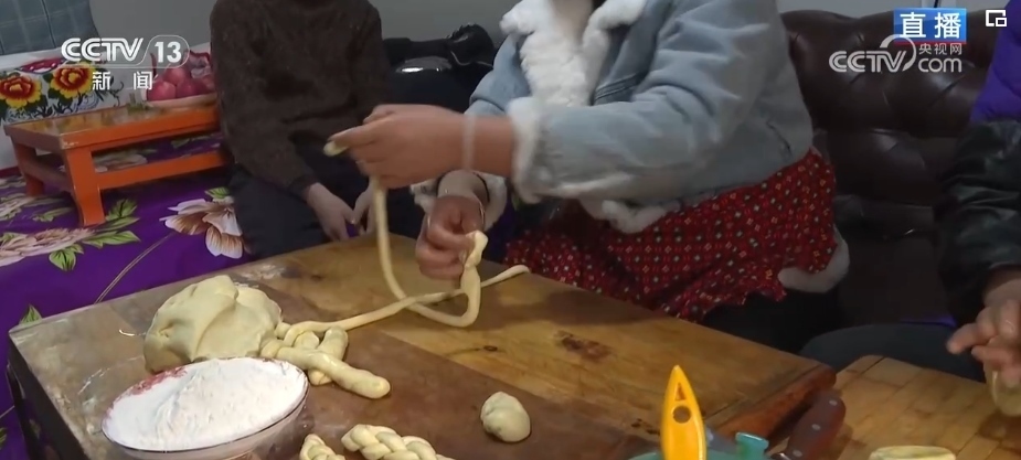 炸年饃是當(dāng)?shù)赝磷迦罕娪哟汗?jié)的傳統(tǒng)習(xí)俗。一家人齊上陣,這邊兩位大姐正在將發(fā)好的面揉好、揪出面劑子、搟成圓形、表面抹上清油,放進油鍋里炸熟。對于土族群眾來說,進入臘月之后就開始做年饃、宰年豬、置辦年貨,年味兒就濃了。炸年饃是當(dāng)?shù)厝罕娖碓感碌囊荒觑L(fēng)調(diào)雨順、五谷豐登、平安順?biāo)斓拿篮迷⒁?。制作年饃的面粉、菜籽油等材料都是政府給受災(zāi)群眾提供的物資。