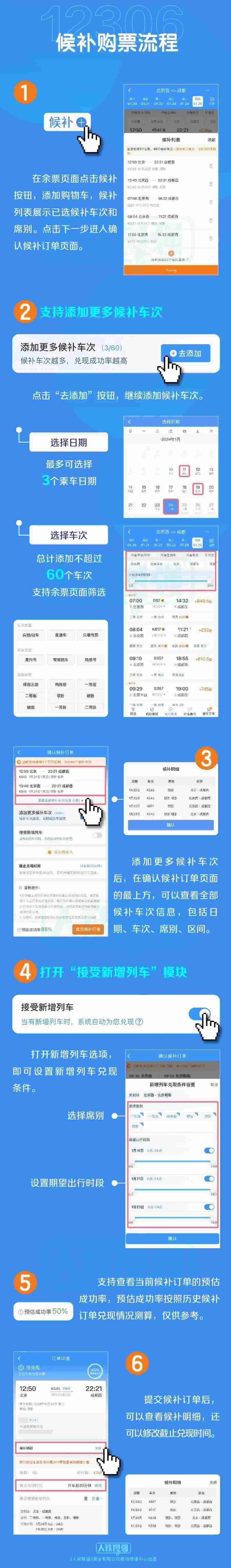 四是臨時新增旅客列車席位優(yōu)先配售給已提交候補訂單的旅客。旅客在提交候補訂單時,可選擇接受購買符合出行需求的新增旅客列車車票,如鐵路部門臨時新增旅客列車,在車票起售時,鐵路12306將自動優(yōu)先配售給已提交候補訂單的旅客,旅客無需人工查詢增開列車信息再購票。