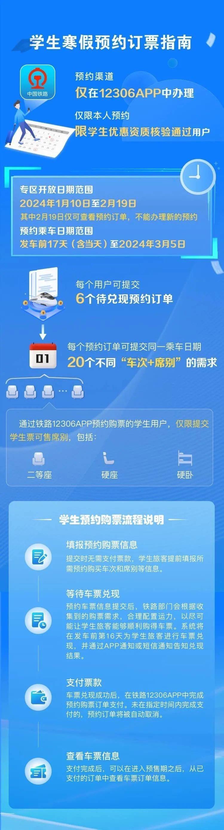 學(xué)生、務(wù)工人員通過鐵路12306專區(qū)購買春運期間火車票,可提交開車前17天(含)以上的出行購票需求,最晚可預(yù)約3月5日的車票。符合條件的旅客朋友可在開車前17天23時前在12306手機客戶端提交購票需求,在開車前16天查詢兌現(xiàn)結(jié)果,須在開車前第16天23時前,通過12306手機客戶端預(yù)約專區(qū)支付票款,逾期未支付的,訂單自動取消;兌現(xiàn)成功后逾期未支付達到5次的,不再提供預(yù)約購票服務(wù)。