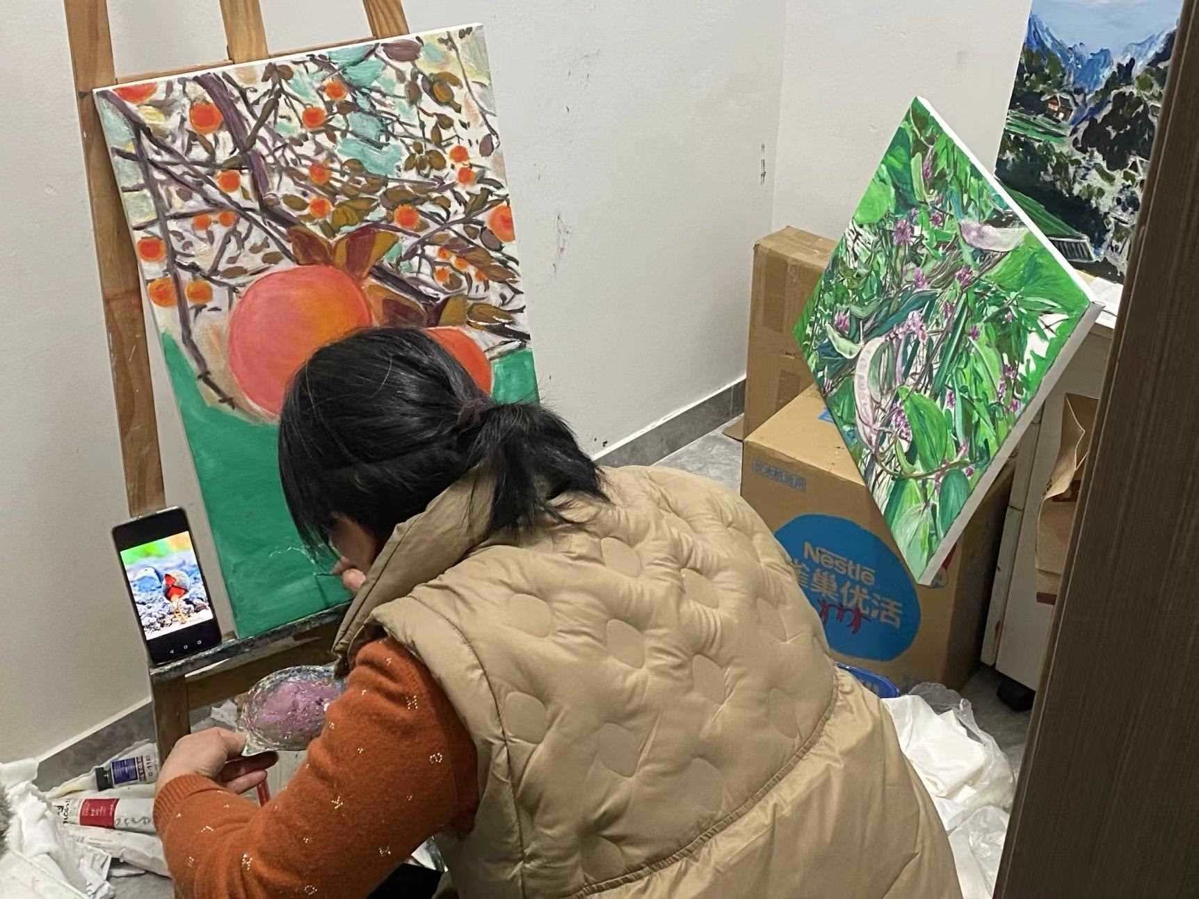 一支畫筆,一盒顏料,一張畫布,這幾乎是雙溪鎮(zhèn)能提供給王柳云的全部。那段時間,她走街串巷,畫山,畫水,畫民居,也“畫”心。憑著一種隱約的天賦和純天然的熱愛,大概過了三個月,王柳云已經(jīng)能大批量地賣畫。