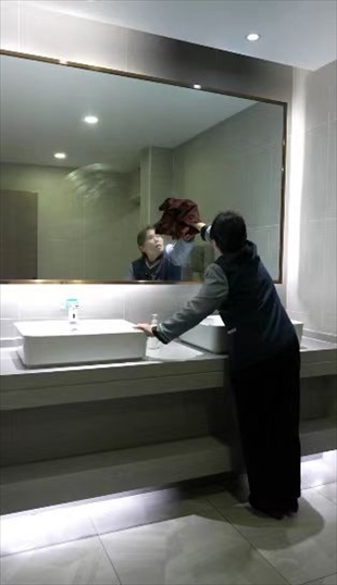 王柳云的保潔面積很大,整個寫字樓的十五層和十七層,地板、桌椅、窗戶、衛(wèi)生間,都是她的職責范圍。“很多人一開完會,杯子、椅子、桌子要清理,還有窗子全部要擦干凈”,她形容自己的工作量“三四個人都干不完”,但她看中了這份工作留給她的一隅,隨便找個角落就可以寫字畫畫。