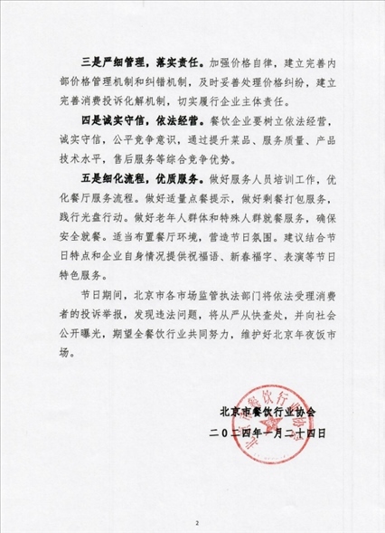 倡議還提到,做好服務人員培訓工作,優(yōu)化餐廳服務流程。做好適量點餐提示,做好剩餐打包服務,踐行光盤行動。做好老年人群體和特殊人群就餐服務,確保安全就餐。適當布置餐廳環(huán)境,營造節(jié)日氛圍。建議結合節(jié)日特點和企業(yè)自身情況提供祝福語、新春福字、表演等節(jié)日特色服務。