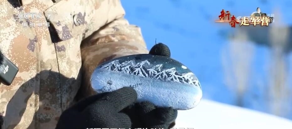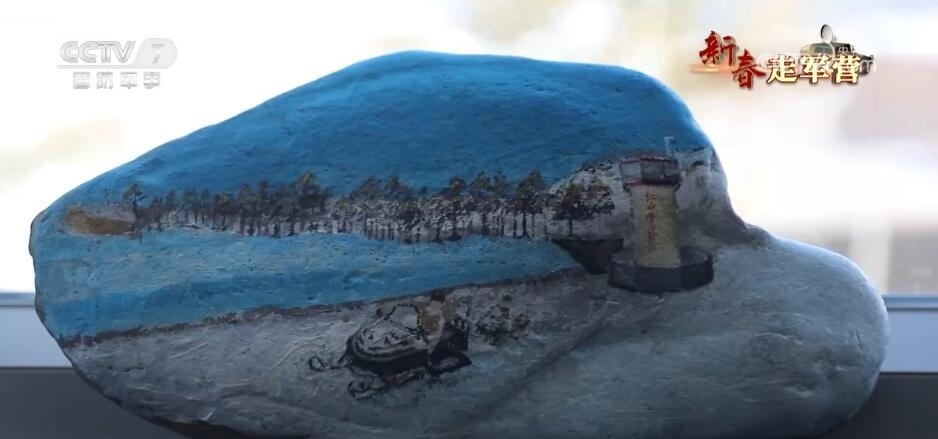 新疆軍區(qū)紅山嘴邊防連 段昱恒:我畫的這塊石頭,這里是我們紅山嘴邊防連的一個(gè)哨樓,這里是我們一起來的6名新兵,從哨樓出來準(zhǔn)備去巡邏,前方有冰河,有雪山。在這里我還畫了一條龍,新的一年是龍年,我也希望大家龍馬精神,見龍皆是福。