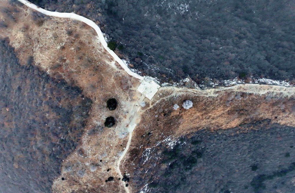 這是位于北京平谷、天津薊州、河北承德交界處的三界碑,以長城和山脊為界劃分出北京、天津和河北三地(2024年1月30日攝,無人機照片)。新華社記者 趙子碩 攝