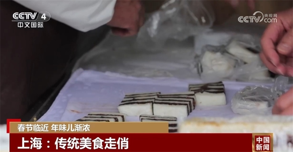 在上海,許多古鎮(zhèn)張燈結(jié)彩迎接春節(jié),老字號(hào)食品店也排起了長龍。在一家糕團(tuán)店前,購買傳統(tǒng)糕點(diǎn)的顧客絡(luò)繹不絕,崇明糕、定勝糕、紅糖糕等各具特色的傳統(tǒng)糕點(diǎn),不僅香甜美味,還能為新年討得一個(gè)好彩頭。