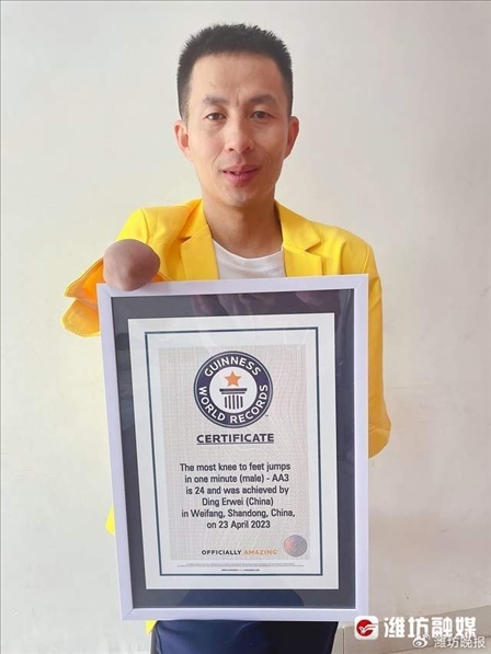 山東濰坊,42歲的丁二偉在8歲時(shí),因?yàn)檎{(diào)皮摸了村里的變壓器造成雙臂截肢。他當(dāng)了11年殘疾人長(zhǎng)跑運(yùn)動(dòng)員,退役已經(jīng)有10年了。2日,他收到吉尼斯總部寄來(lái)的證書(shū),挑戰(zhàn)的項(xiàng)目是一分鐘跪跳起,他一分鐘跳了24個(gè),是跪跳起跳得最多的人。